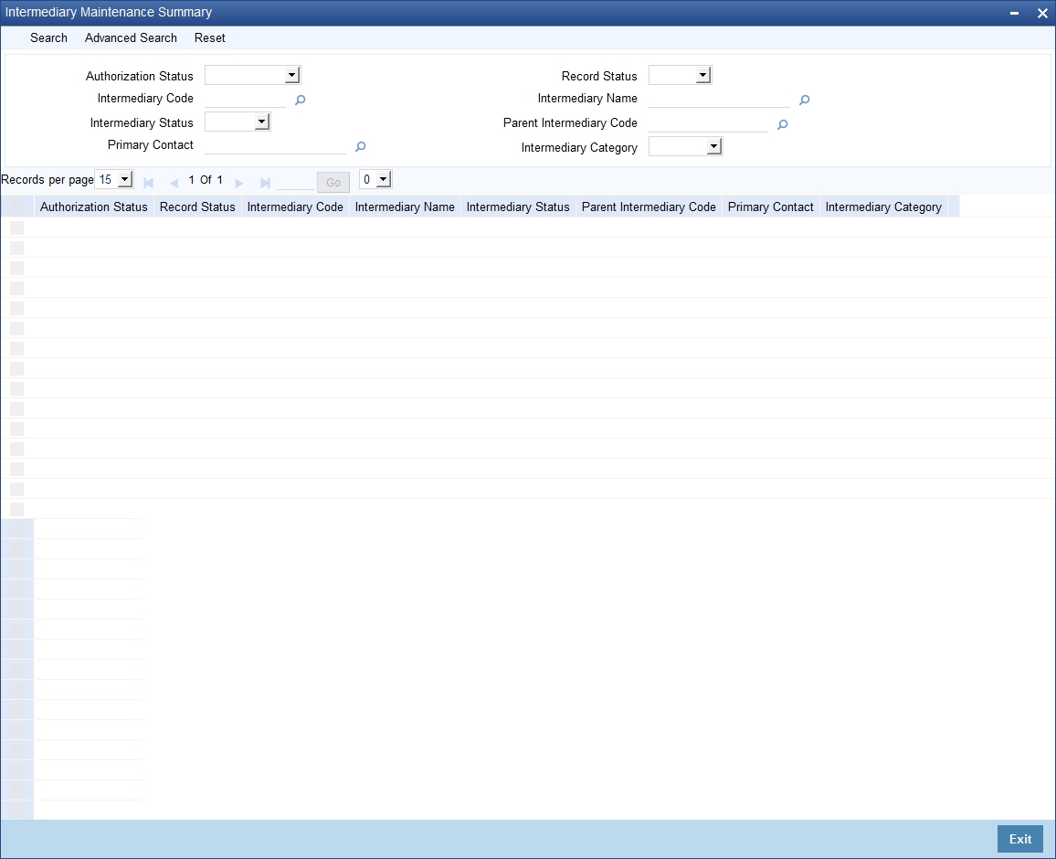 You can view details of all intermediaries in the ‘Intermediary Maintenance Summary’ screen. You can invoke this screen by typing ‘INSINMNT’ in the field at the top right corner of the Application tool bar and clicking the adjoining arrow button.