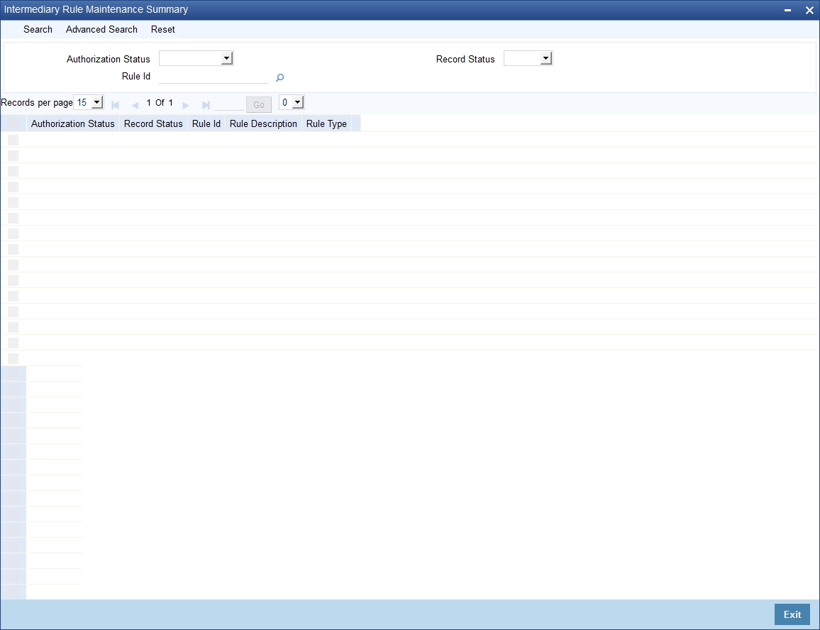 An Intermediary Rule identifies the method to calculate commission payable to the Intermediary and Pre-Payment/Late Payment penalty charge to be recovered from the Intermediary. You can maintain such rules in the ‘Intermediary Rule Maintenance’ screen. You can invoke this screen by typing ‘INDRLMNT’ in the field at the top right corner of the Application tool bar and clicking the adjoining arrow button.