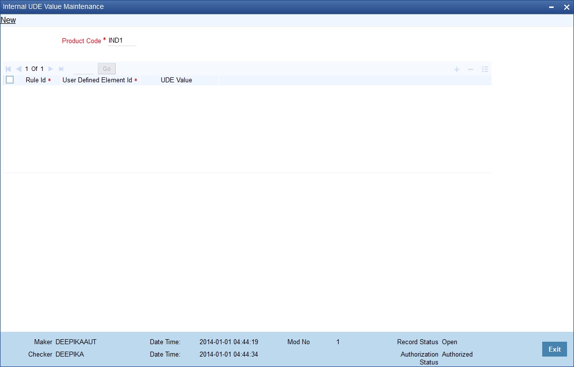 As you can recall, you can link rules to a product. A rule consists of System Data Elements and the User Data Elements. You can maintain the values for the UDEs defined for the rule in the ‘Internal UDE Value Maintenance’ screen. You can invoke this screen by typing ‘INDIUDVM’ in the field at the top right corner of the Application tool bar and clicking the adjoining arrow button.