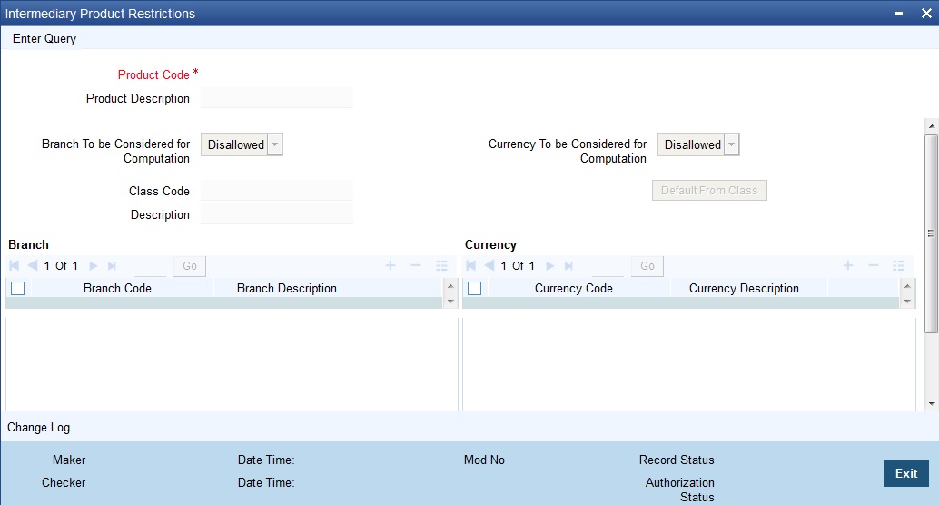 You can maintain a list of branches and currencies that should be allowed or disallowed for all transactions under the product. You can specify such restrictions using the ‘Intermediary Product Restrictions’ screen. You can invoke this screen by typing ‘INDPRDRS’ in the field at the top right corner of the Application tool bar and clicking the adjoining arrow button.