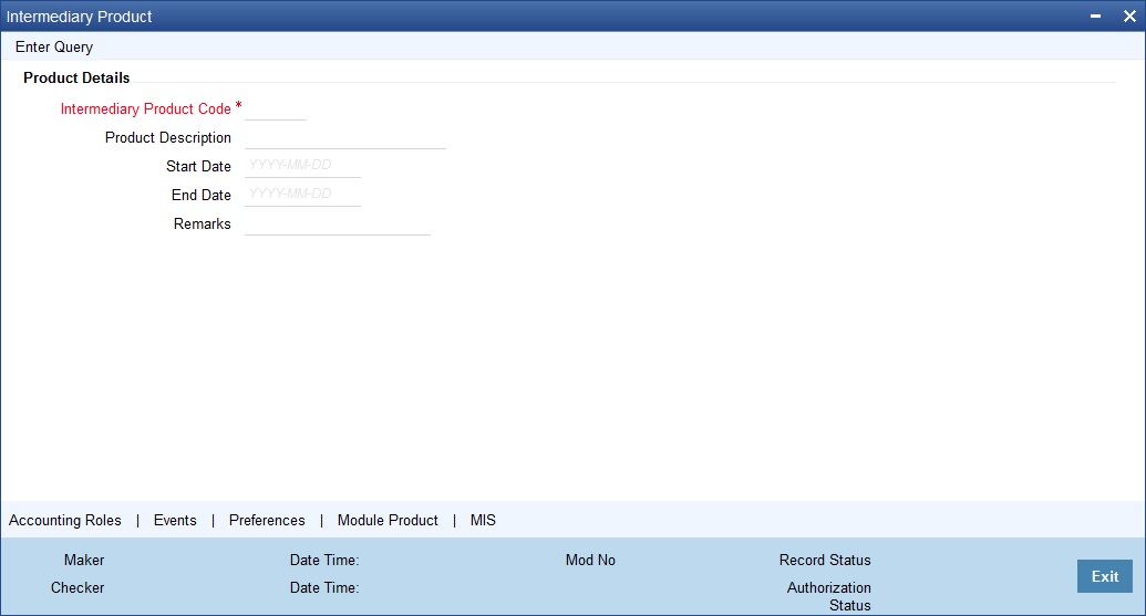 You can maintain a product and link it to lending transactions requiring an intermediary. You can maintain an intermediary product using the ‘Intermediary Product’ screen. You can invoke this screen by typing ‘INDPRMNT ’ in the field at the top right corner of the Application tool bar and clicking the adjoining arrow button.