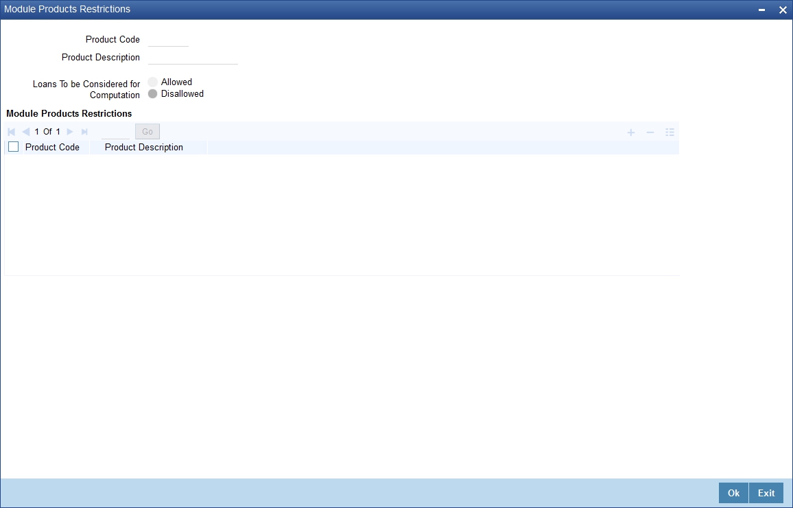 Specify the product code that should be included in the ‘Allowed’ or ‘Disallowed’ list. The adjoining option list displays all valid product codes maintained in the system for the following modules:
