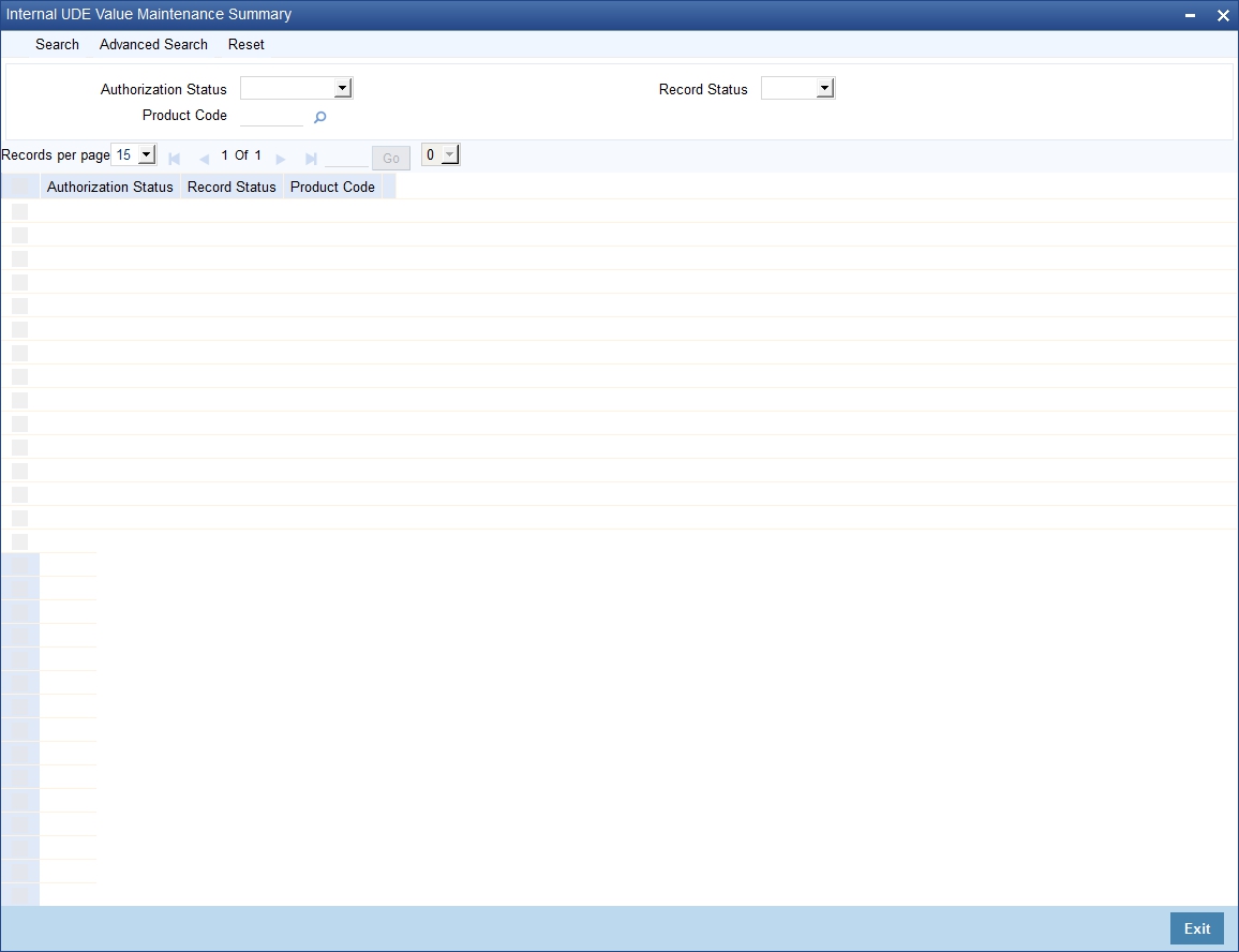 You can view summary details of all UDE values in the ‘Internal UDE Value Maintenance Summary’ screen. You can invoke this screen by typing ‘INSIUDVM’ in the field at the top right corner of the Application tool bar and clicking the adjoining arrow button.