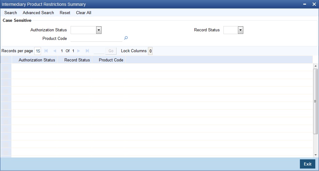 You can view summary details of all product restrictions using the ‘Intermediary Product Restrictions Summary’ screen. You can invoke this screen by typing ‘INSPRDRS’ in the field at the top right corner of the Application tool bar and clicking the adjoining arrow button.