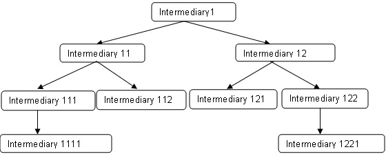 Oracle FLEXCUBE supports commission settlement between intermediaries in a hierarchical way. The system computes the hierarchy amount payable to the parent intermediary for each intermediary based on the intermediary maintenance. The following diagram illustrates the hierarchical structure that can be maintained for intermediaries.