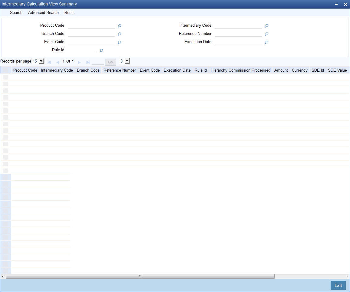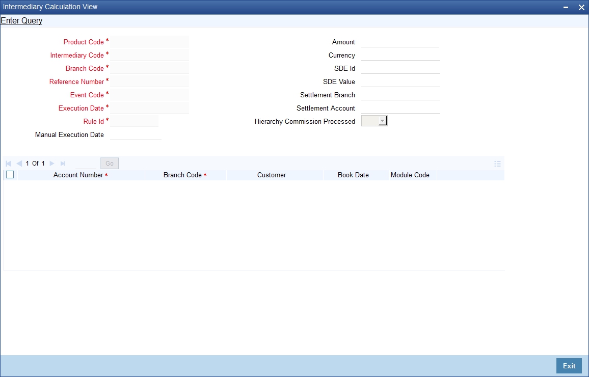 You can view all the accounts considered for commission/charge calculation across intermediary products for a given execution date, using the ‘Intermediary Calculation View’ screen. You can invoke this screen by typing ‘INDIVIEW’ in the field at the top right corner of the Application tool bar and clicking the adjoining arrow button.