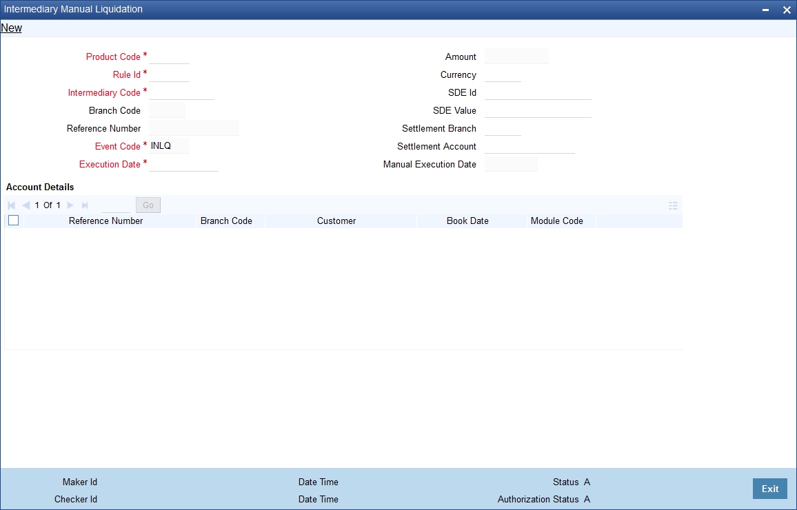 As mentioned before, commission calculation and liquidation can be automated as part of the EOD batch. However, you can also manually liquidate commission or charge for the failed settlements in the batch, through the ‘Intermediary Manual Liquidation’ screen. You can invoke this screen by typing ‘INDMPMCL’ in the field at the top right corner of the Application tool bar and clicking the adjoining arrow button.