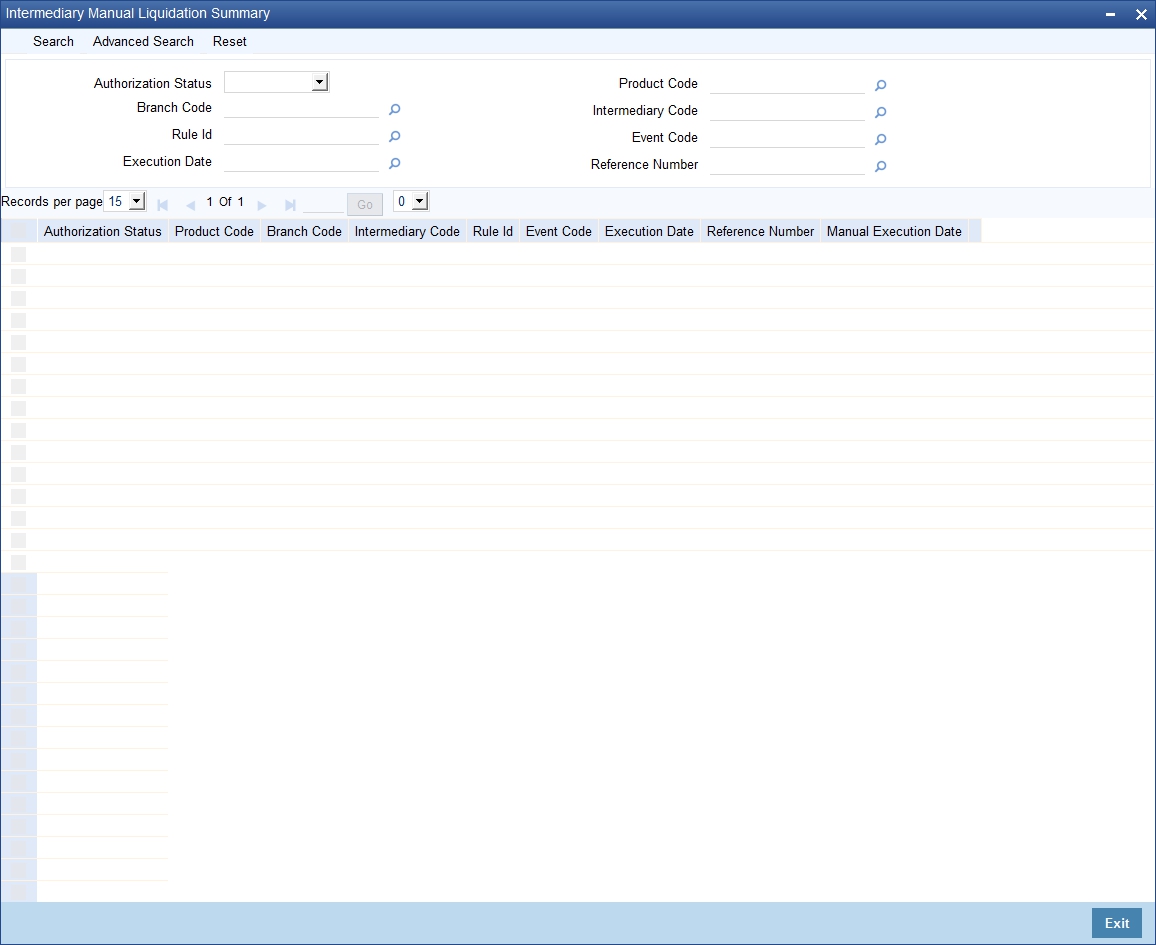 You can view summary of all manual liquidations through the ‘Intermediary Manual Liquidation Summary’ screen. You can invoke this screen by typing ‘INSMPMCL’ in the field at the top right corner of the Application tool bar and clicking the adjoining arrow button.