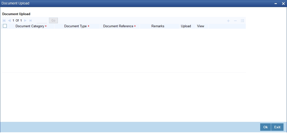 You can upload documents during interaction using 'Document Upload' screen. These documents are retrievable to the bank users or customers involved in the interaction. To invoke this screen, click 'Documents' button in 'Interaction Input' screen.