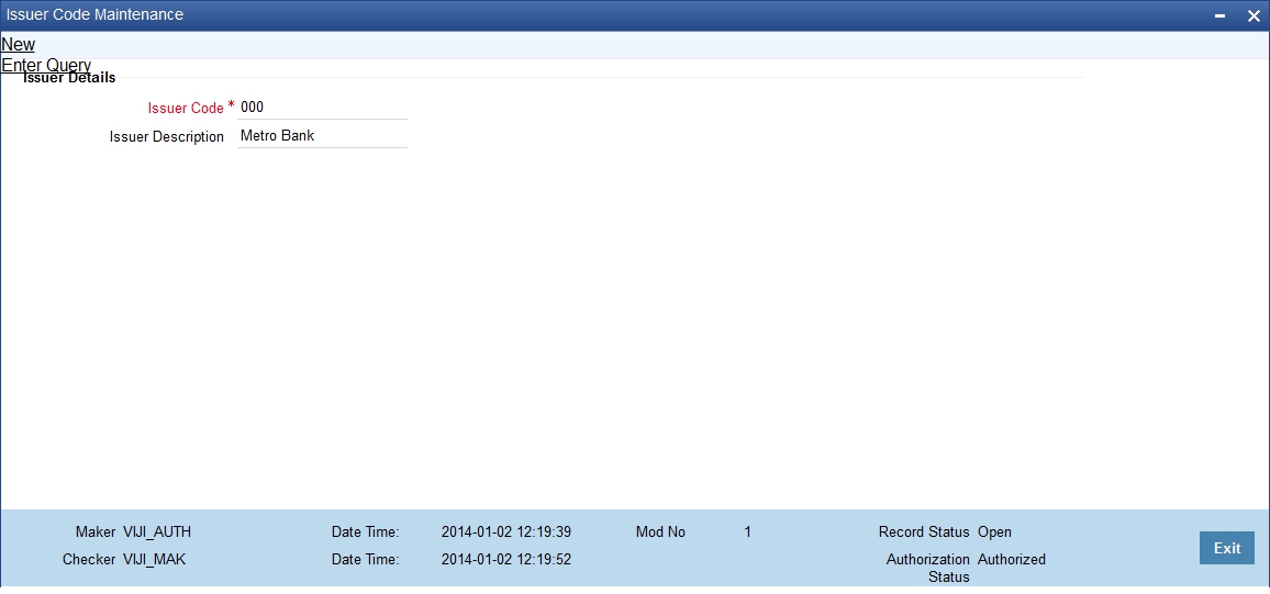 Use the ‘Issuer Code – Summary’ screen to query for Issuer Code Maintenance records, by specifying the following parameters: