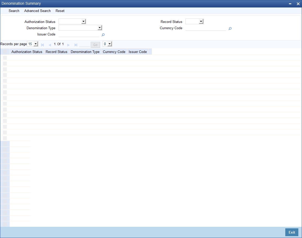 Use the ‘Denomination Summary’ screen to query for Denomination Maintenance records using the following parameters: