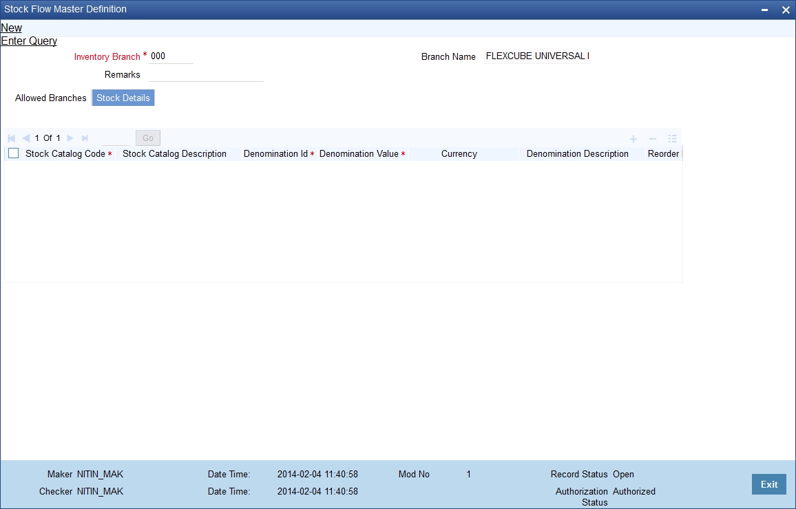 You can use the ‘Stockflow Master Definition’ screen to define and maintain the inventory stock flow. This maintenance must be done for each inventory branch. The stock flow master definition allows the following: