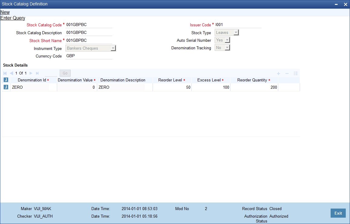 A Stock Catalog Code identifies a particular financial instrument that is used within the bank (For example Demand Drafts drawn on the same bank in local currency). It is an internal alphanumeric code used within the system to track stock of financial instruments. This code is used internally within the software for tracking stock.
