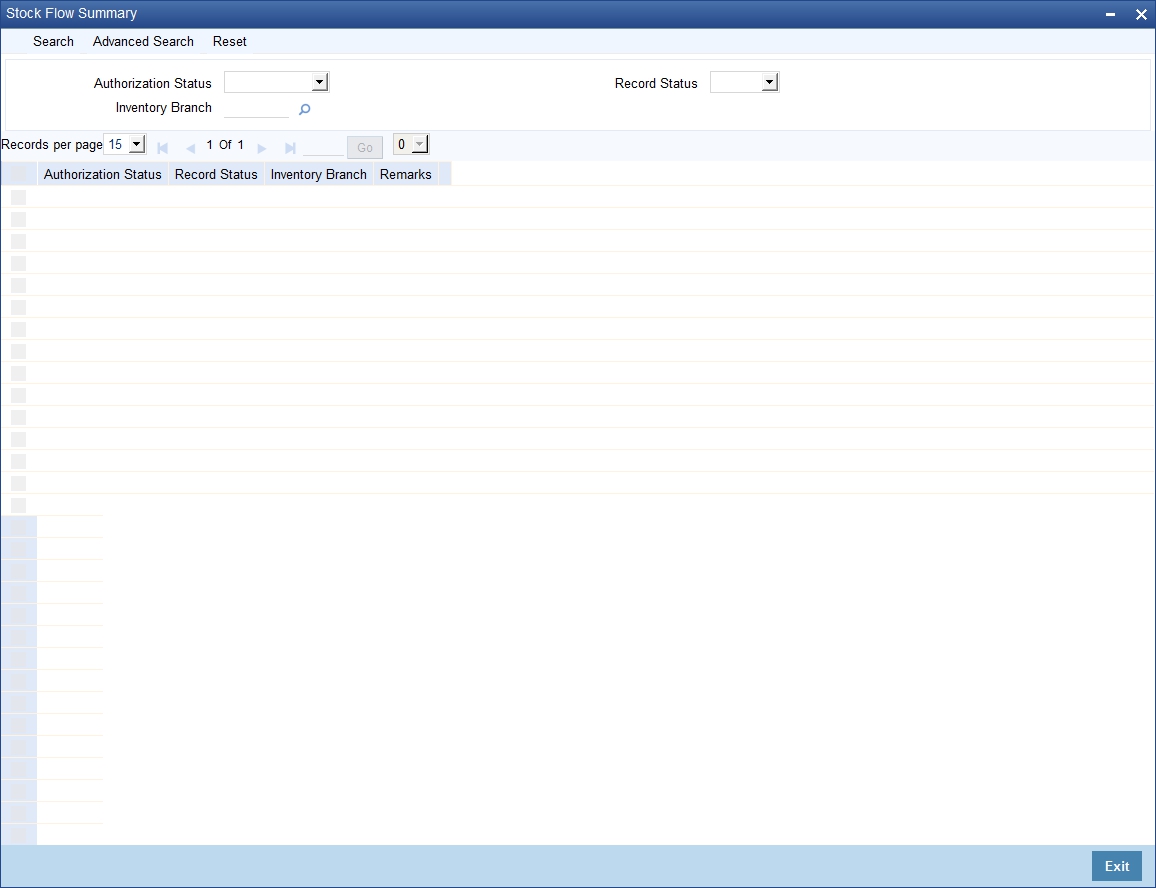 You can use the Stockflow Summary) screen to query for Stockflow definition records by specifying the following parameters: