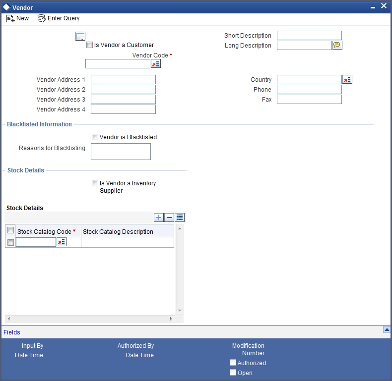 You can use the ‘Stock Catalog Summary’ screen to query for stock catalog records based on the following parameters: