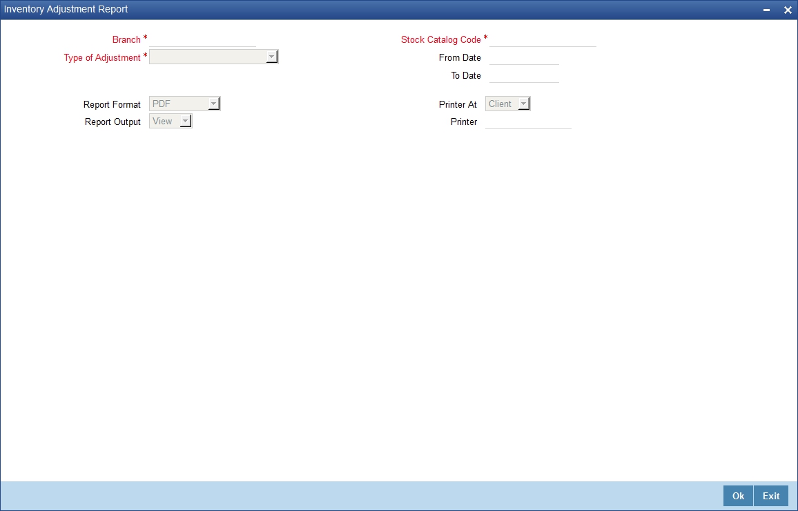 Inventory Balance can be adjusted in the 'Adjust inventory balance' screen. You can generate a report of such inventory balance adjustment in the ‘Inventory Adjustment Report’ screen. You can invoke this screen by typing ‘IVRADJBL’ in the field at the top right corner of the Application tool bar and clicking on the adjoining arrow button.