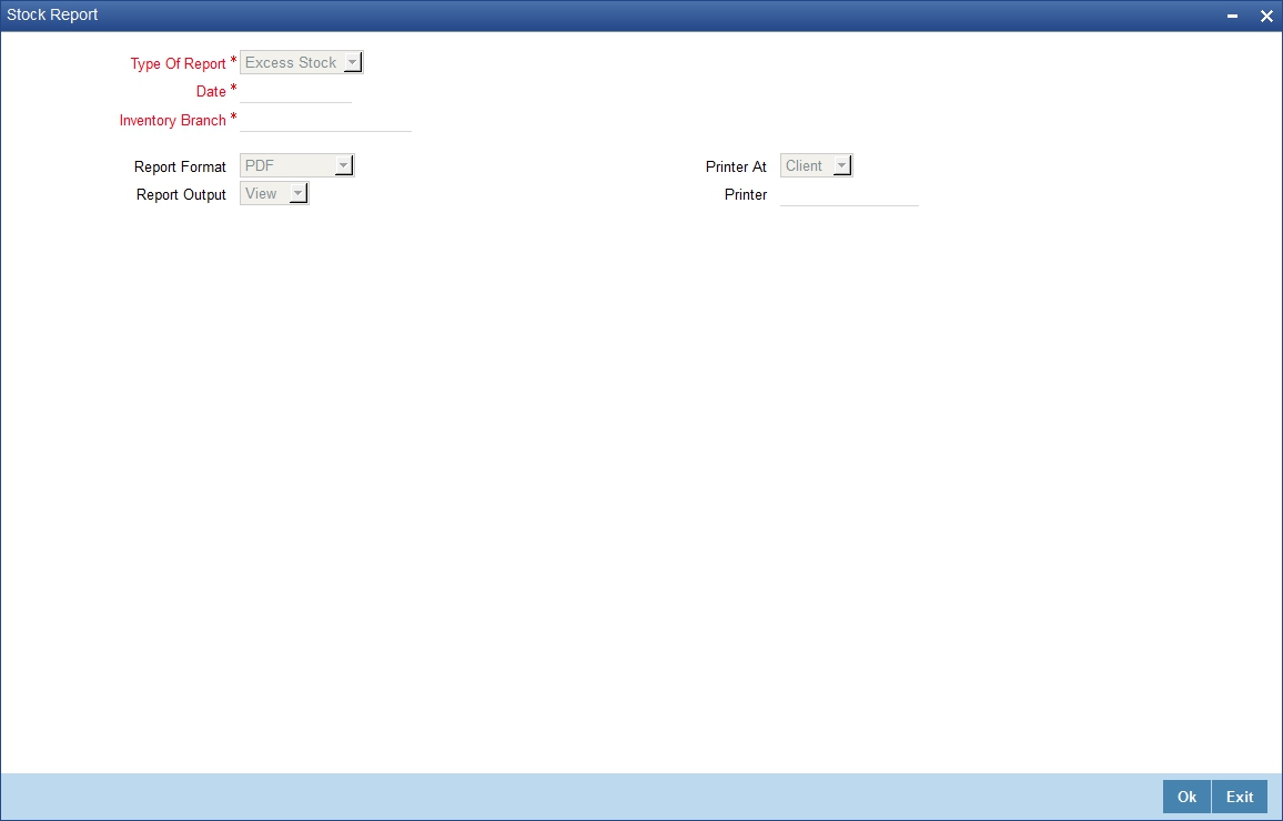 You can invoke Stock Report screen by typing ‘IVRSTKRP’ in the field at the top right corner of the Application tool bar and clicking on the adjoining arrow button.