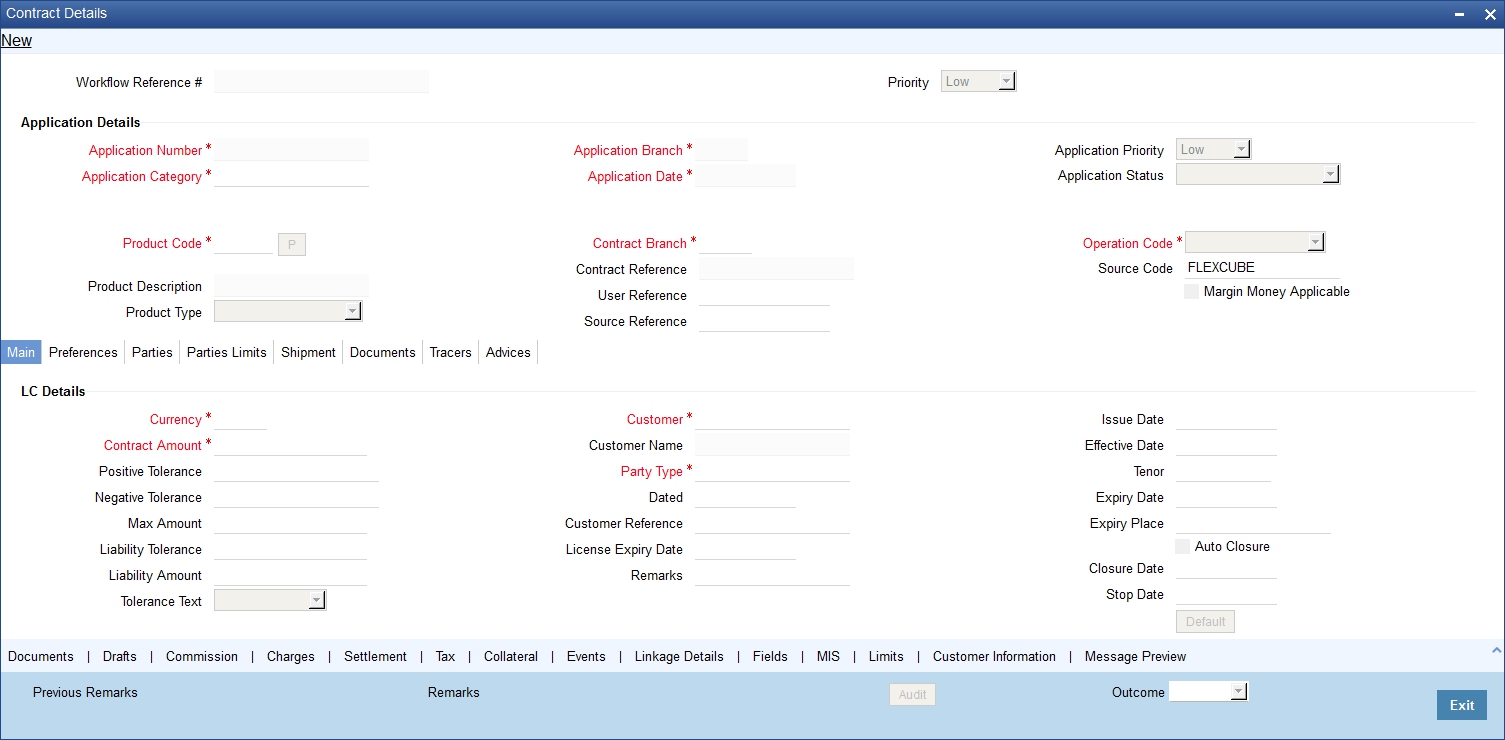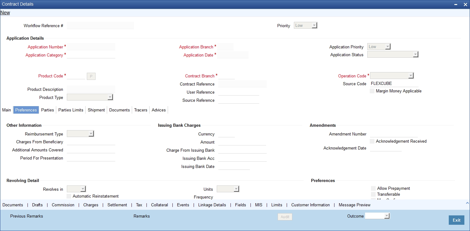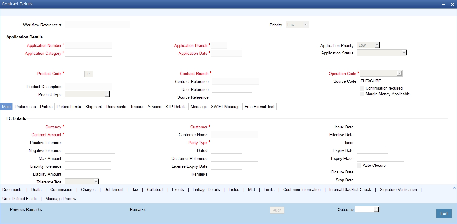 Refer to the chapter titled ‘Processing a LC Contract’ in the Letter of Credit User Manual for further details about the fields, tabs and buttons in the screen.