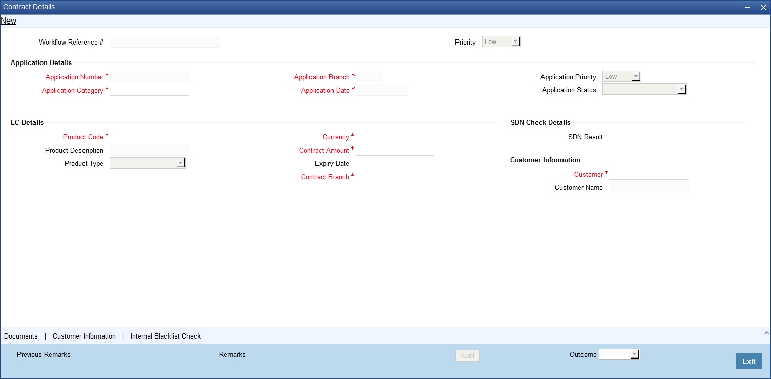In this screen, you can view the applicant’s details. If the applicant’s name is listed in the bank's internal list of global blacklisted customers, you can report it to the internal authorities of the bank. You can continue with the process of creating LC only when the customer passes these checks. The system displays the information message as "The task is completed successfully. The workflow reference number is xxx"