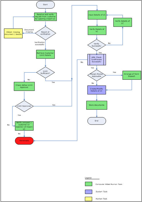 This process includes checks like SDN check, internal blacklist check, contact details verification, etc. The LC is created only when the customer passes all these checks. In case of ‘Failed’ of any of the checks, the LC initiation process is terminated. The bank verifies all the details/documents to ensure that the information/documents required for AML checks are obtained. In case the details captured are incorrect, the bank makes the necessary modifications. If the verification is ‘Passed’, the bank may proceed to conduct AML checks. Once AML checks are carried out, the result is passed on to the parent process.