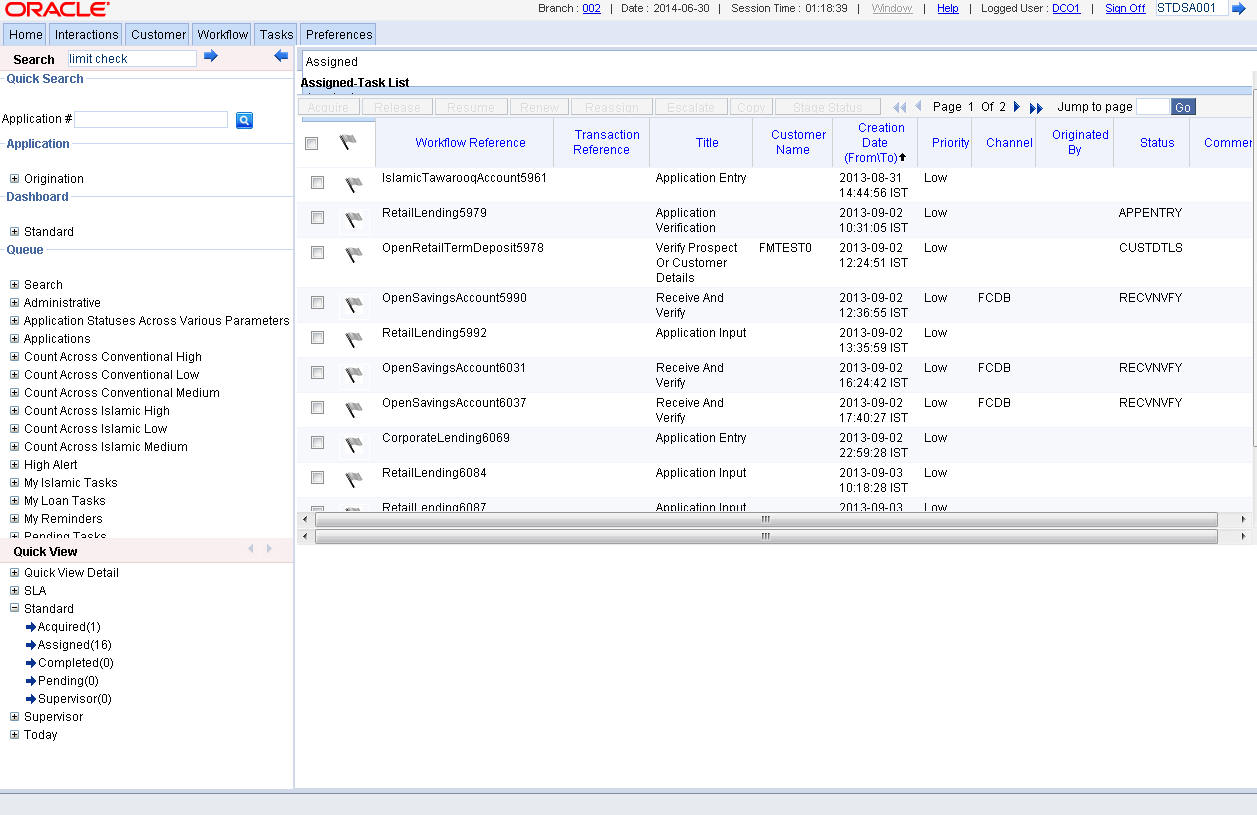 Go to the Assigned list in the system. The system displays all the assigned activities. Click ‘Acquire’ button adjoining the ‘Verify Nature/Details of Transaction’ task to acquire it. The system displays the information message as "The task was successfully acquired!"