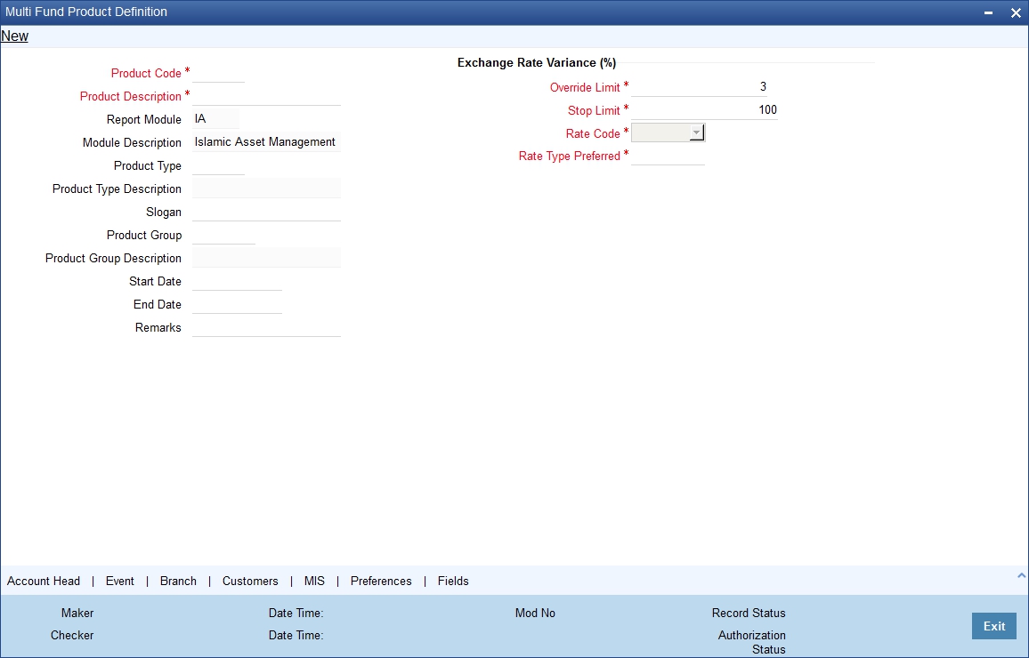 For any product you create in Oracle FLEXCUBE, you can define generic attributes, such as branch, currency, and customer restrictions, profit details, tax details, etc., by clicking on the appropriate icon in the horizontal array of icons in this screen. For a Funds product, in addition to these generic attributes, you can specifically define other attributes.