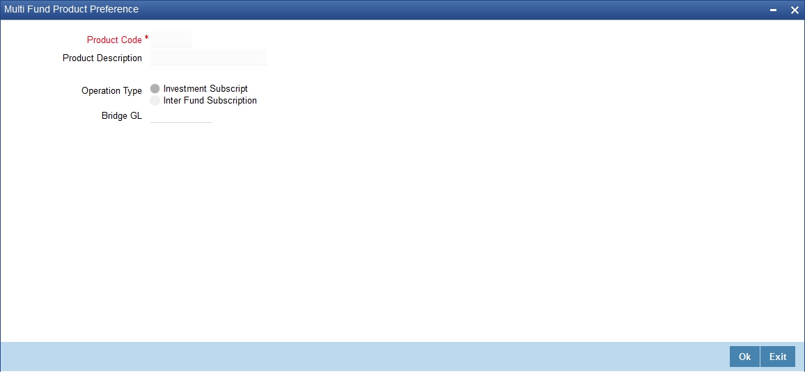 Select the Multi Subscription product from the option list. The option list includes all valid Multi Subscription products for which you have specified the Operation Type as Inter-Fund Subscription.