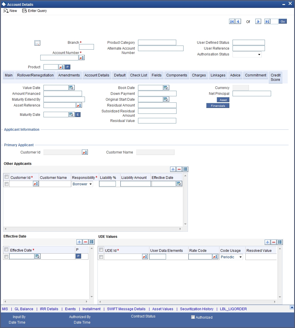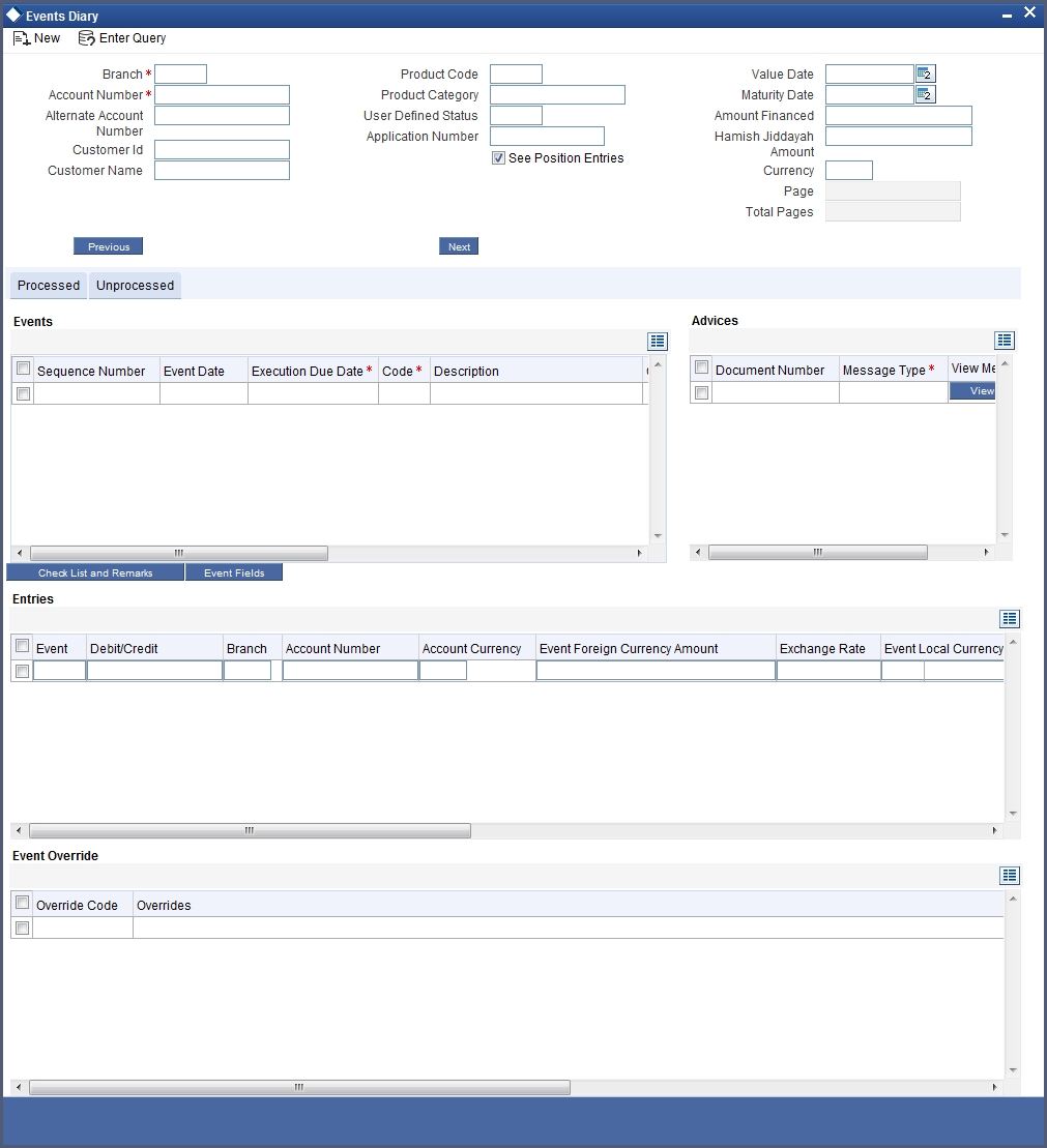 An ‘event’ may be defined as any action starting from application entry to collections. This module captures the details of events applicable to the account. The screen displays both processed and unprocessed events.