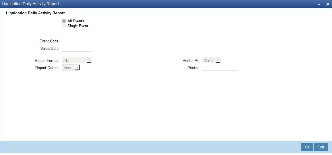 The Liquidation Daily Activity Report provides information on all liquidation events or a particular event which took place on a specified date. You can set the preferences for generation of the report via the ‘Liquidation Daily Activity Report’ screen.
