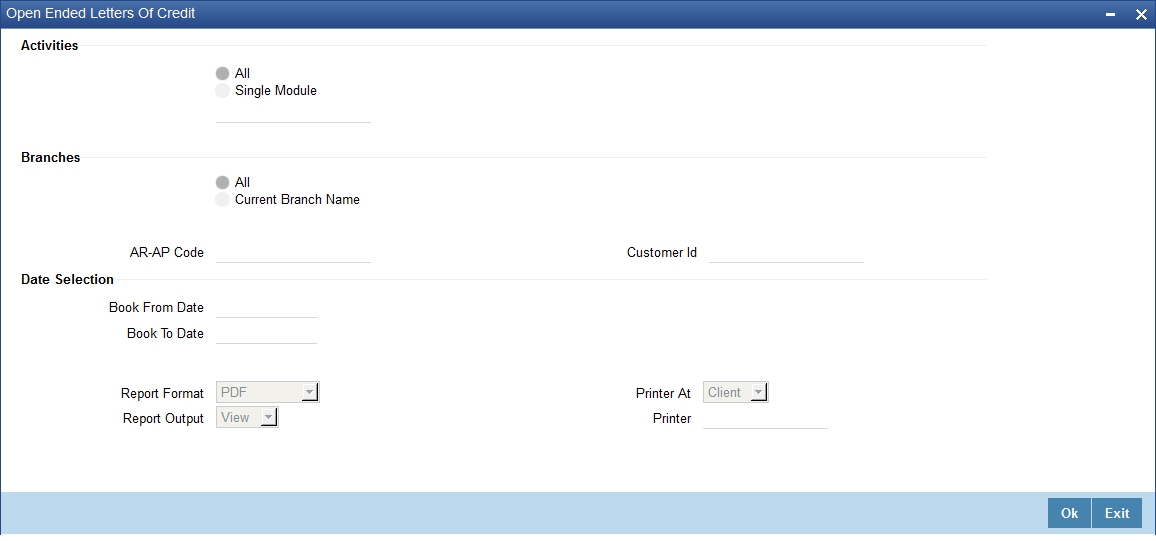 The Outstanding Items report provides the details of all outstanding liquidation records in both receivable and payable accounts, across the modules in Oracle FLEXCUBE. This report also helps you retrieve the details of open ended letters of credits. This report generates the details based on AR/AP code or CIF/counterparty.