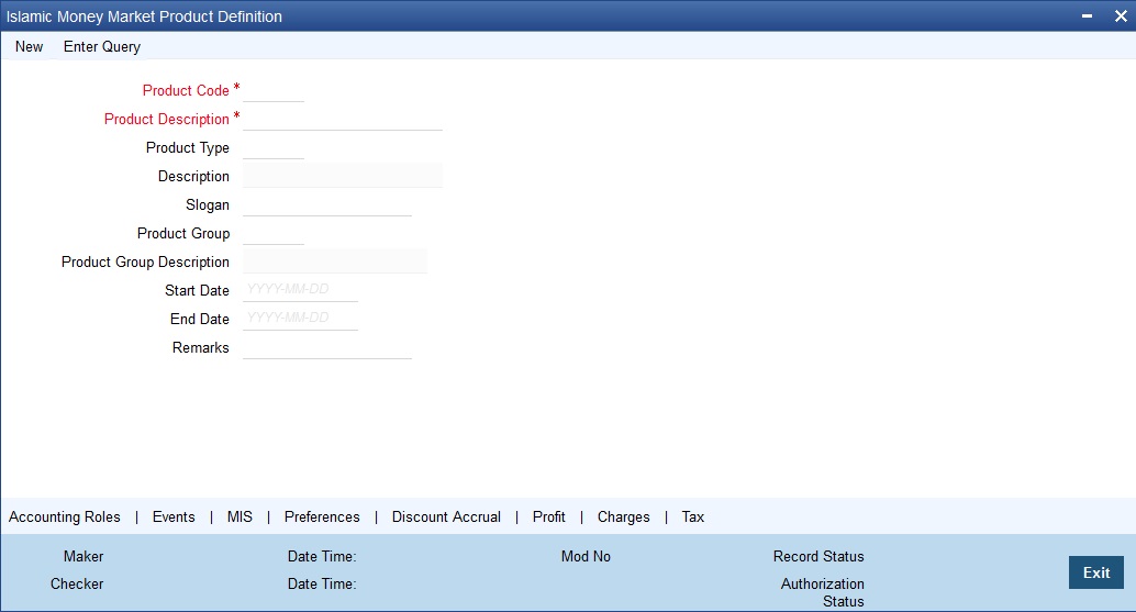 While defining a new product, you should enter a code, which is unique across the different modules of Oracle FLEXCUBE. For instance, if you have used MM01 for the Money Market module, you cannot use it as a code in any other module.