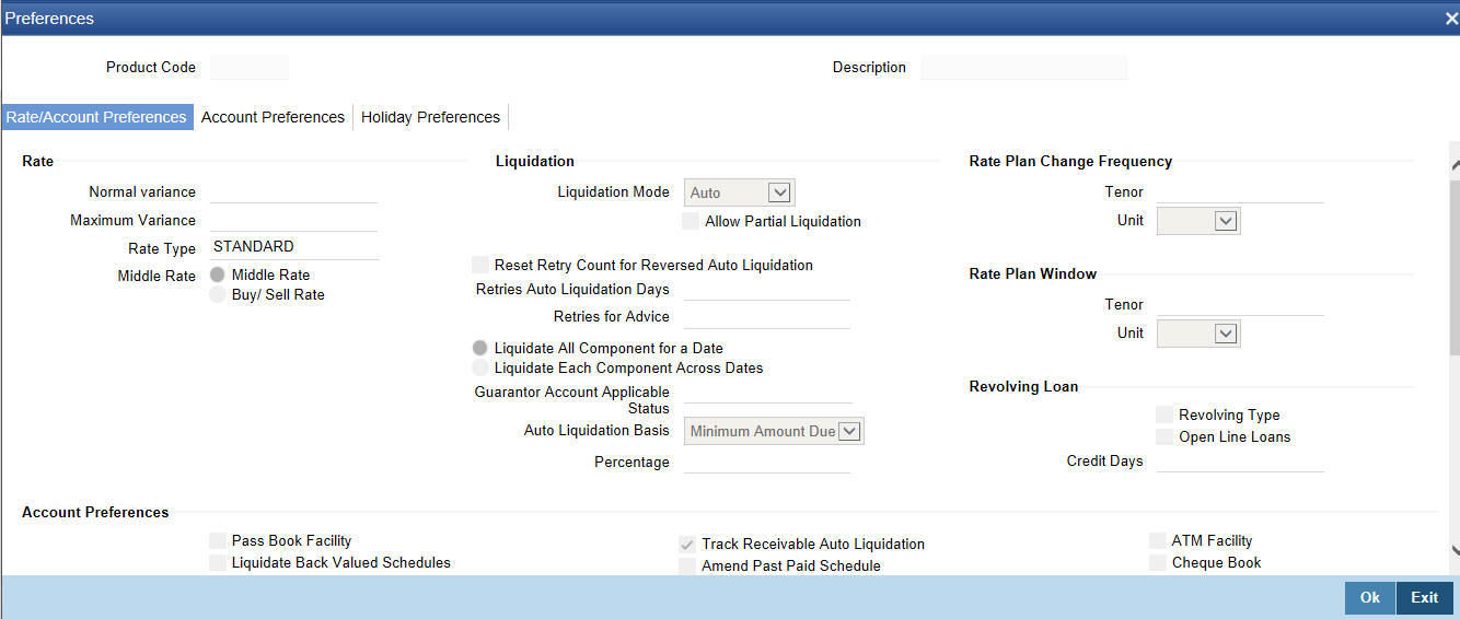The options you choose, ultimately, shape the product. These details are used for loan account processing. Click ‘Preferences’ button on the ‘Product Definition’ screen to move to this section of the screen.
