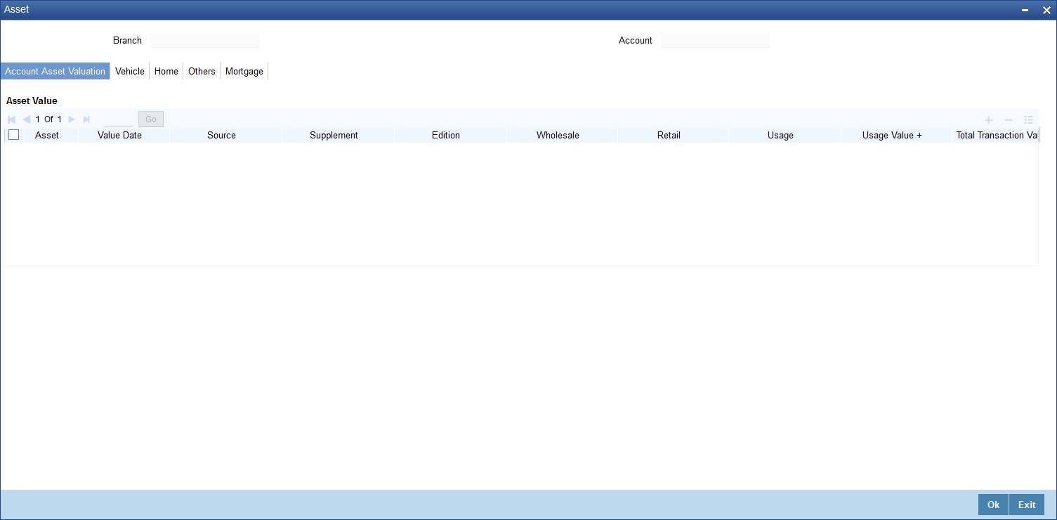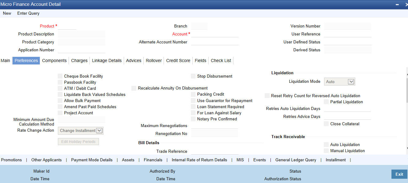 The Account details include the book date, the value date, the maturity date, and down payment amount of the Loan account. In case of Rolled over loans, the original start date is also stored. The details of the liability parties to the account are maintained. The Main Customer and description are displayed. Also other applicants of a loan such as Co-signers, Guarantors etc can be captured. These details of the co applicants, their responsibility as a Cosigner, guarantor etc, and the contribution of the co applicants to the Loan are provided here.