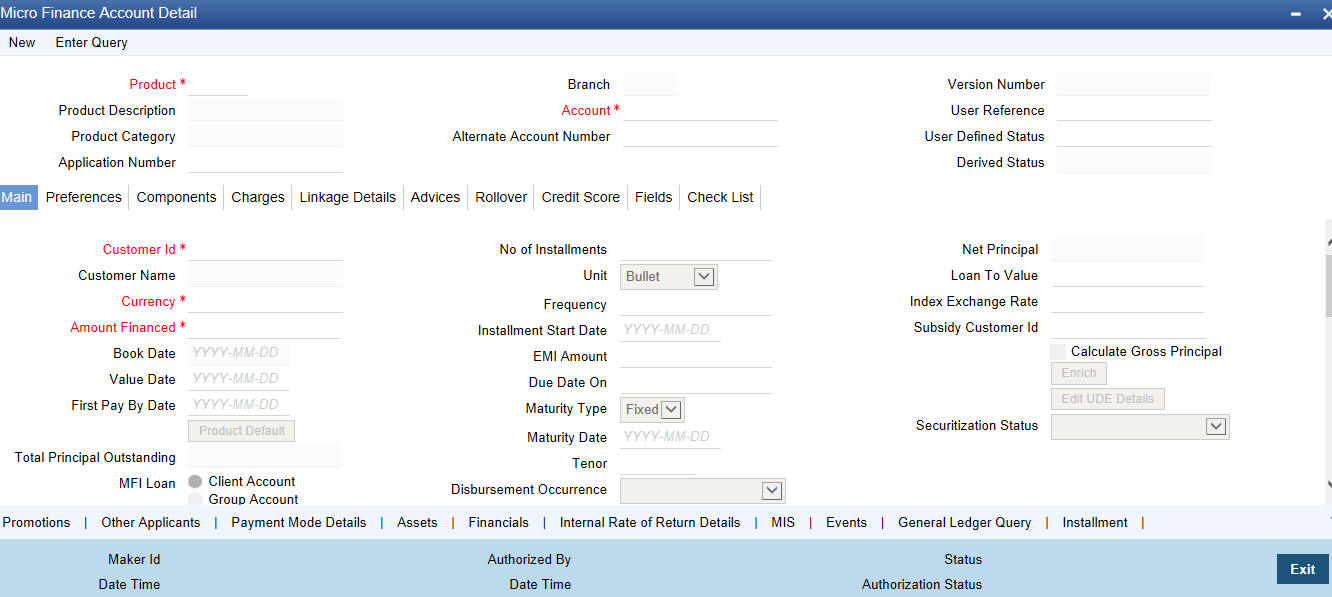 You can capture the Customer, Currency and Amount Financed and create a Light Loan. This is a default Loan that takes all other details from the defaults the product provides. You can create a loan account using the ‘Micro Finance Account Details’ screen. You can invoke this screen by typing ‘MFDACCNT’ in the field at the top right corner of the Application tool bar and clicking the adjoining arrow button.