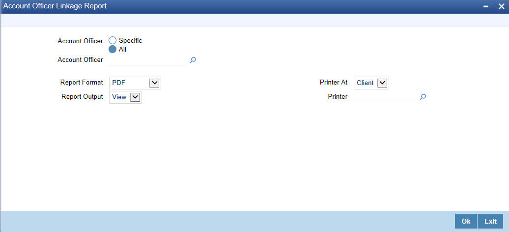 You can set your preferences as to the output of a report using ‘Account Officer Linkage Report’ screen. You can invoke this screen by typing ’ MFRAOFLR’ in the field at the top right corner of the Application tool bar and clicking on the adjoining arrow button.