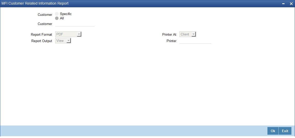 You can set your preferences as to the output of a report using ‘MFi Customer Related Information Report’ screen. You can invoke this screen by typing ‘MFRCRINF’ in the field at the top right corner of the Application tool bar and clicking on the adjoining arrow button.