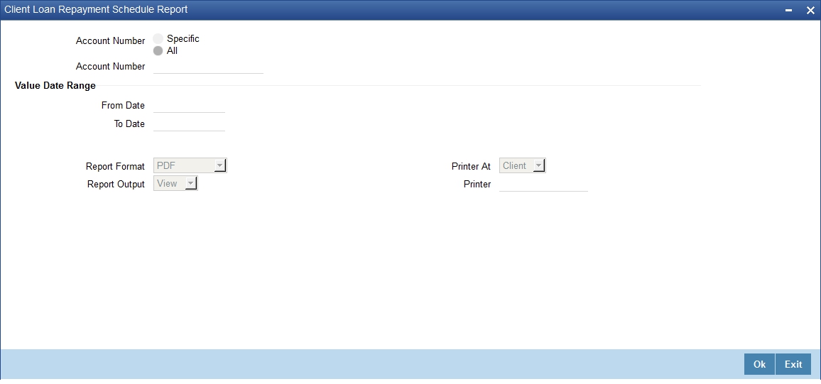 You can set your preferences as to the output of a report using ‘Client Loan Repayment Schedule Report’ screen. You can invoke this screen by typing ‘MFRSCHNT’ in the field at the top right corner of the Application tool bar and clicking on the adjoining arrow button.