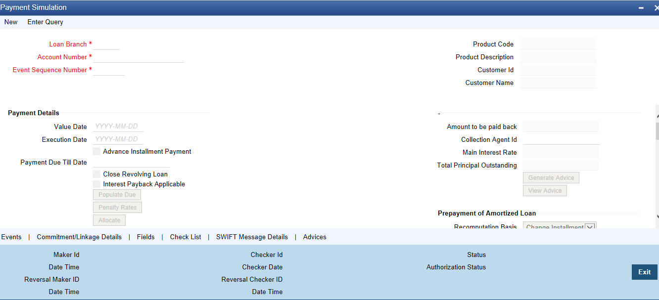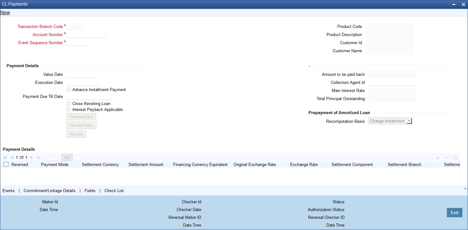 Payment can be against any or all or a combination of the components due. Prepayments will attract a pre-payment penalty to be charged. The payment computed by the system can be overridden by the amount negotiated by the customer and a subsidy is captured as amount waived. The amount accepted is either waived or capitalized. Depending on the mode selected, additional payment details such as clearing house details, settlement products to be used if the settlement is through another product of Oracle FLEXCUBE, etc are captured.