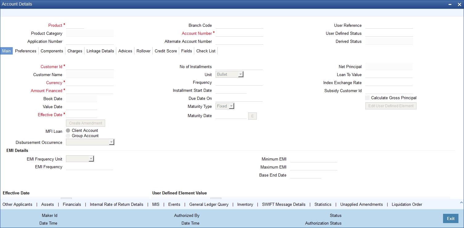 For more details and the field explanation of each tab, refer to the section ‘Creating a Loan Account’ in ‘Account Creation’ chapter of this User Manual.