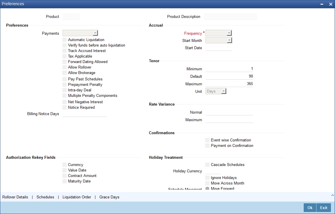 Once you specify the attributes of schedules in the Product Preferences screen, the default schedules, which you want, applied to the deals involving the product, and are specified through the Product Schedules screen.