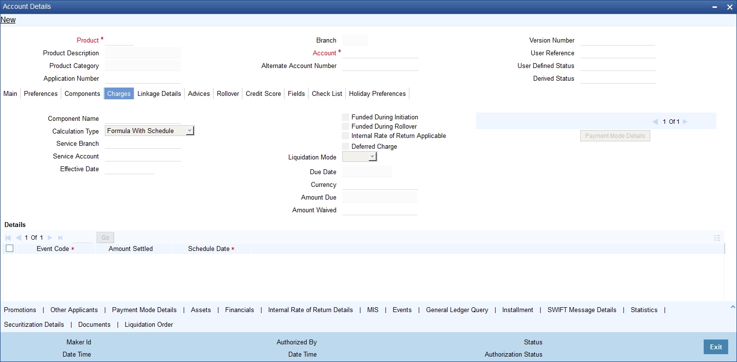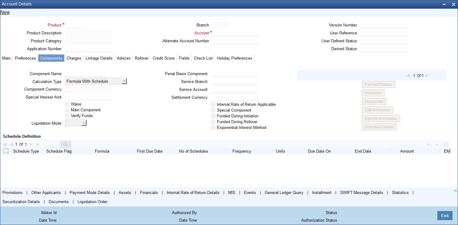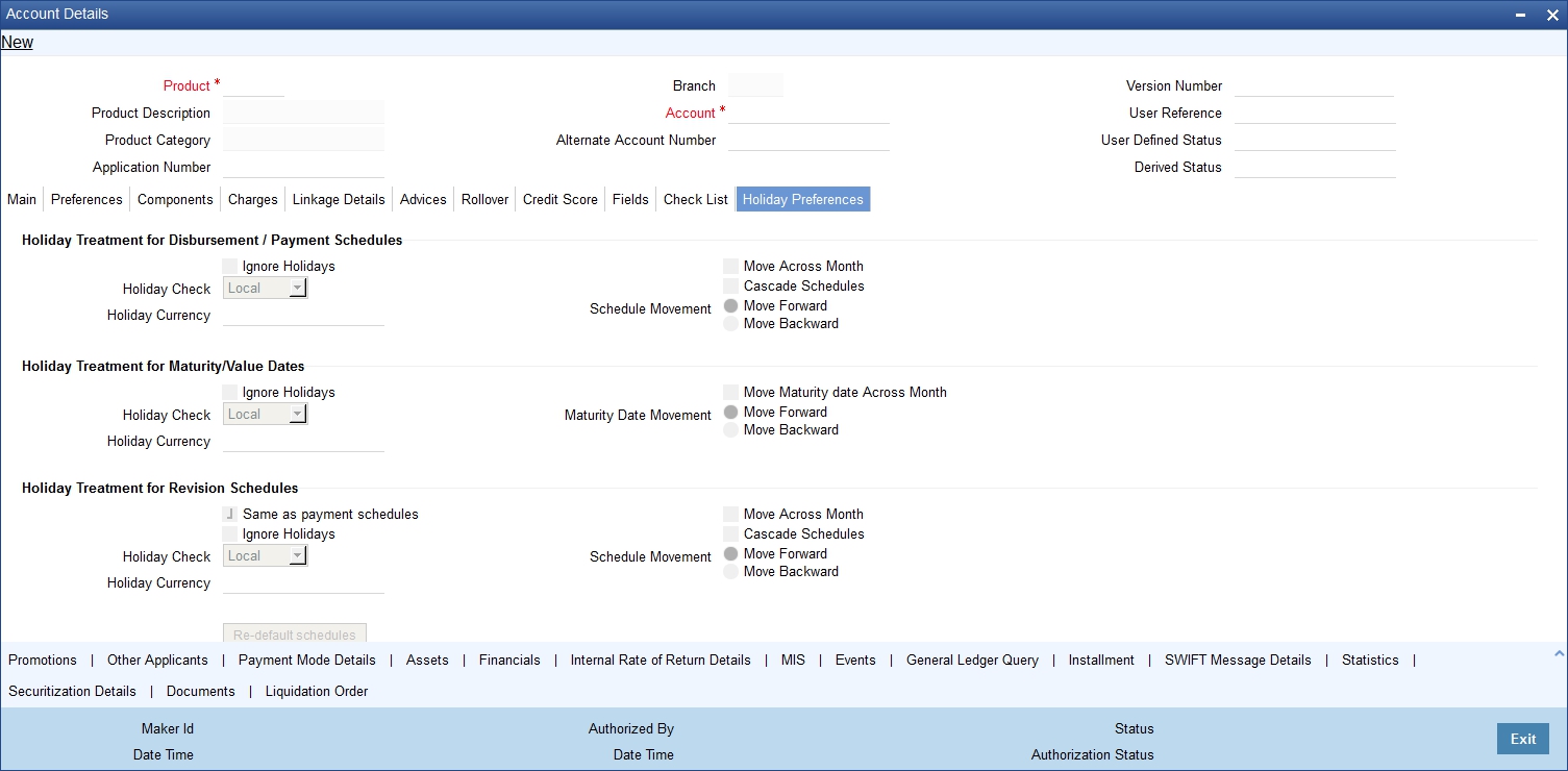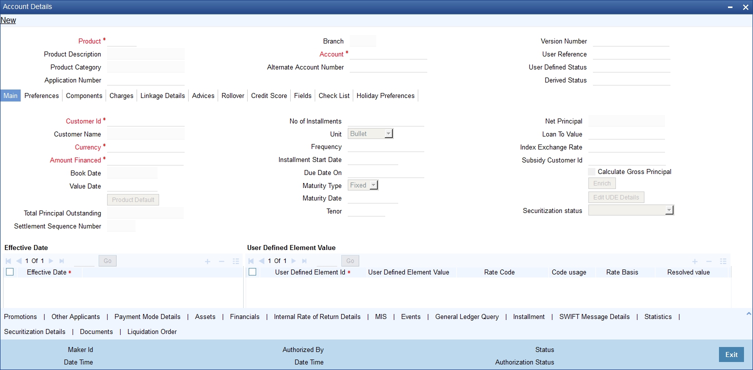 Click ‘Product Default’ button after entering product code, customer ID, currency and amount financed. The system defaults other details maintained for the selected product. The system also defaults the schedule definitions from the product and computes the detailed schedules. After clicking the ‘Product Default’ button, you cannot change the product code. Also, the system prompts you to click the ‘Product Default’ button once again if you change ‘Customer ID’, ‘Currency’ or ‘Amount Financed’ fields.