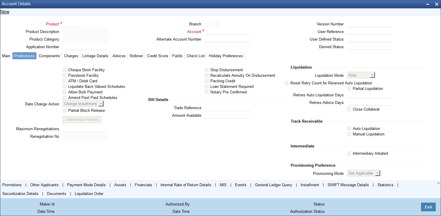 This is enabled only for those Mortgages products for which the ‘CL against Bill’ option is selected at the product preference level.