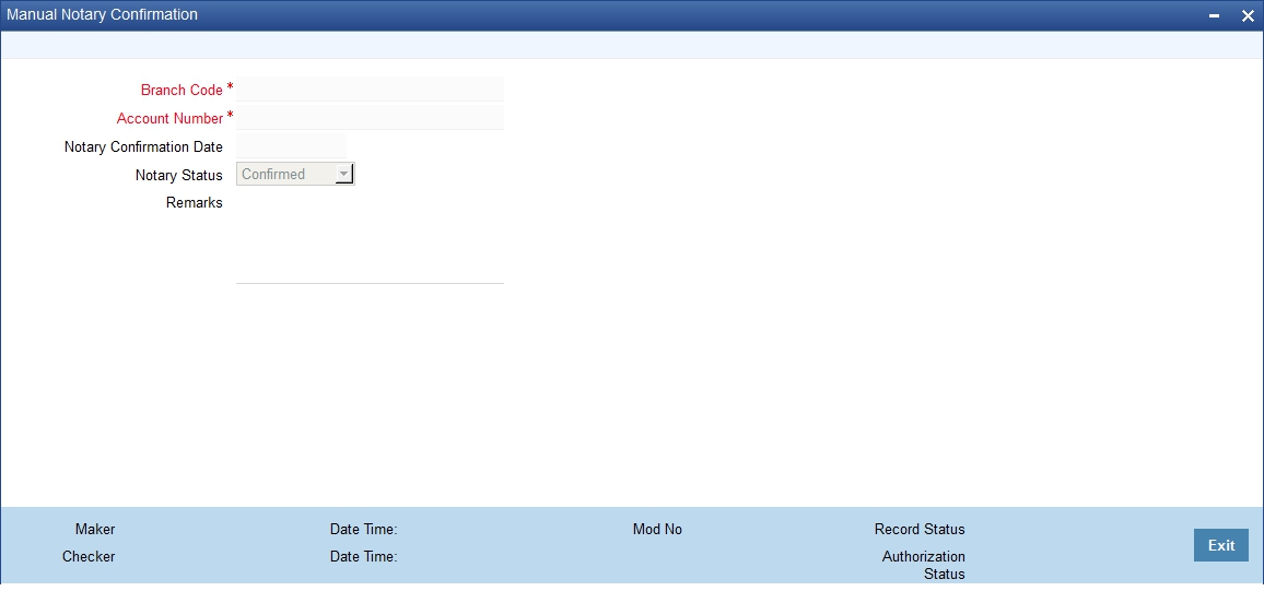 Usually a notary confirms the collaterals (linked to the mortgage) before mortgage account creation. In case, the confirmation from notary is not received before mortgage account creation, you can initiate confirmation manually using the ‘Manual Notary Confirmation’ screen. You can invoke this screen by typing ‘MODNOCON’ in the field at the top right corner of the Application tool bar and clicking the adjoining arrow button.