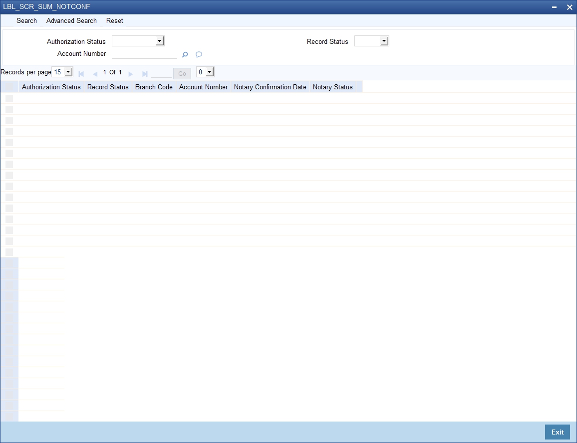 You can view a summary of all Mortgage Manual Notary Confirmation, through the ‘Mortgage Manual Notary Confirmation Summary’ screen. You can invoke this screen by typing ‘MOSNOCON’ in the field at the top right corner of the Application tool bar and clicking the adjoining arrow button.