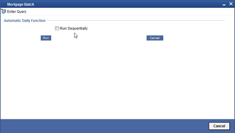 You also have the option to execute the batch programs through the ‘Mortgage Batch’ screen. You can also invoke this screen by typing ‘MODBATCH’ in the field at the top right corner of the Application tool bar and clicking on the adjoining arrow button.