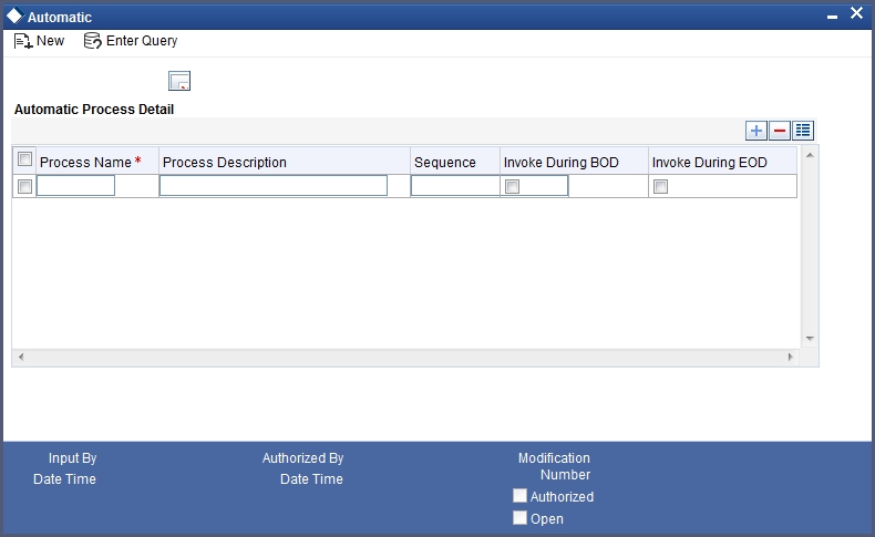 You have the facility to configure the batch processes to be executed either at EOD or BOD or both, as per the bank’s requirement. This is achieved through the ‘Automatic Process Definition’ screen. You can invoke this screen by typing ‘CLDTPROC’ in the field at the top right corner of the Application tool bar and clicking on the adjoining arrow button.