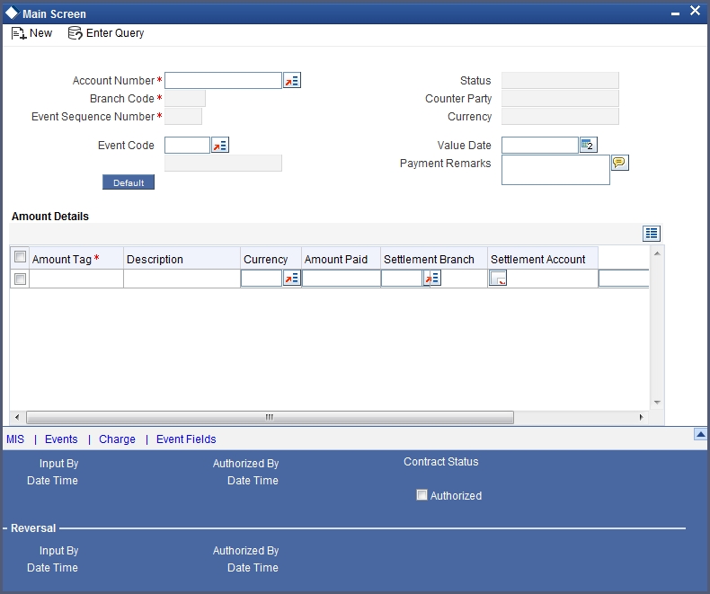 Click save icon after specifying the details in order to trigger the event for the specified account. This record needs to be authorized for the event to be triggered.