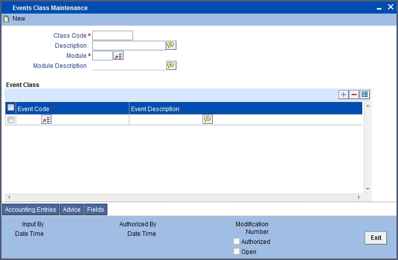 The Events Class Maintenance screen is as shown below: