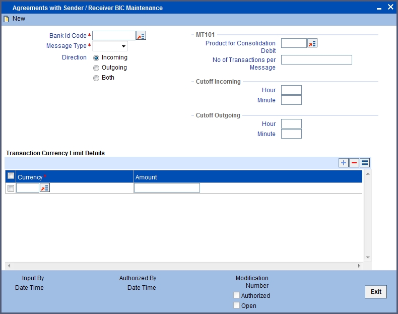 You can maintain agreement with the sender/receiver BIC through the ‘Agreements with Sender/Receiver BIC Maintenance’ screen. You can invoke the ‘Agreements with Sender/Receiver BIC Maintenance’ screen by typing ‘ISDCCYRS’ in the field at the top right corner of the Application tool bar and clicking the adjoining arrow button.