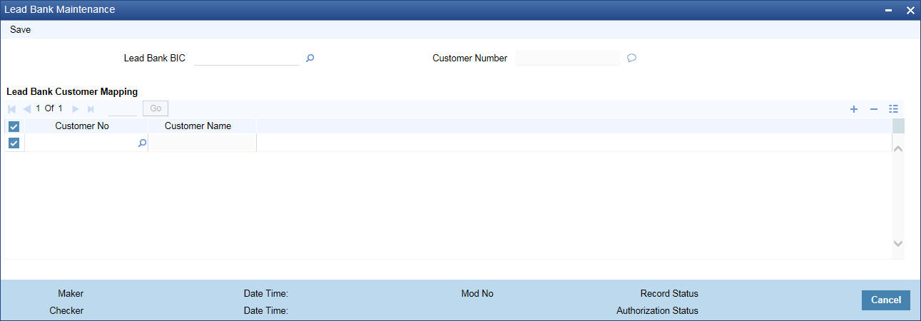 You can invoke ‘Lead Bank Maintenance’ screen by typing ‘MSDLBKMT’ in the field at the top right corner of the application tool bar and clicking on the adjoining arrow button.You can capture the Lead Bank mapping for corporate customers in this screen.